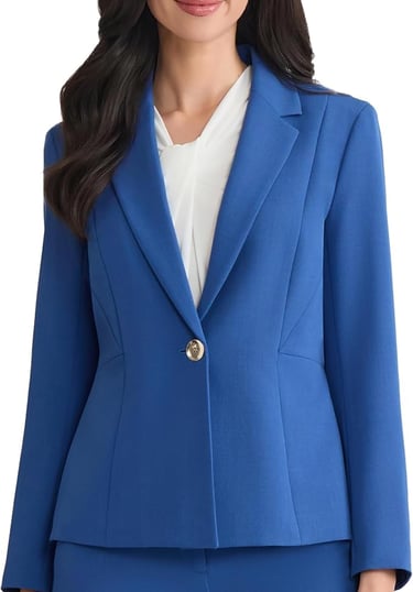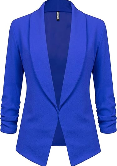 Open-Front Blazer in Electric Blue: A more modern, collarless version that offers a clean line, perfect for showing off a chunky gold necklace or silk scarf.